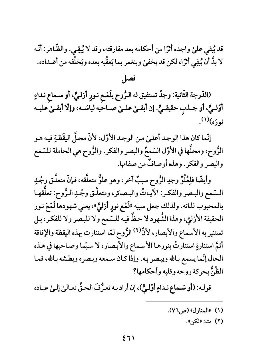 وأيضًا فلِعُلُوِّ وجدِ الرُّوح سببٌ آخر، وهو علوُّ متعلَّقه، فإنّ متعلَّق وجْدِ السّمع والبصر والفكر: الآياتُ والبصائر، ومتعلَّق وجْدِ الرُّوح: تعلُّقها بالمحبوب لذاته. ولذلك جعل سببه «لَمْع نورٍ أزليٍّ»، يعني شهودها لَمْعَ نور الحقيقة الأزليِّ، وهذا الشُّهود لا حظَّ فيه للسّمع ولا للبصر ولا للفكر، بل تستنير به الأسماع والأبصار، لأنّ (¬٢) الرُّوح لمّا استنارت بهذه اليقظة والإفاقة أتمَّ استنارةٍ استنارتْ بنورها الأسماع والأبصار، لا سيّما وصاحبها في هذه الحال إنّما يسمع بالله ويبصر به. وإذا كان سمعه وبصره وبطشه بالله، فما الظّنُّ بحركة روحه وقلبه وأحكامها؟