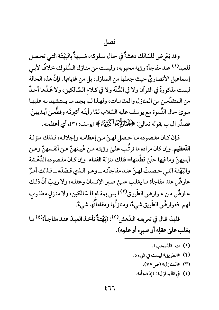 وقد يَعْرِض للسّالك دهشةٌ في حال سلوكه، شبيهةٌ بالبَهْتَة التي تحصل للعبد (¬١) عند مفاجأة رؤية محبوبه، وليست من منازل السُّلوك، خلافًا لأبي إسماعيل الأنصاريِّ حيث جعلها من المنازل، بل من غاياتها. فإنّ هذه الحالة ليست مذكورةً في القرآن ولا في السُّنّة ولا في كلام السّالكين، ولا عَدَّها أحدٌ من المتقدِّمين من المنازل والمقامات، ولهذا لم يجد ما يستشهد به عليها سوى حال النِّسوة مع يوسف عليه السّلام، لمّا رأينَه أكبرنَه وقطَّعن أيديهنّ. فصدَّر الباب بقوله تعالى: {فَلَمَّا رَأَيْنَهُ أَكْبَرْنَهُ} [يوسف: ٣١]، أي أعظمنه.