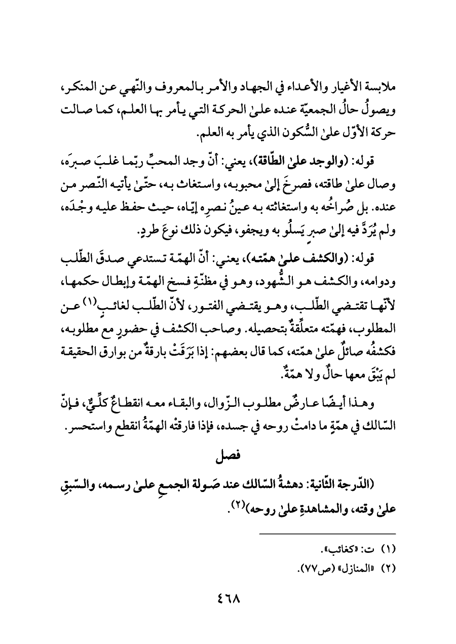 وهذا أيضًا عارضٌ مطلوب الزّوال، والبقاء معه انقطاعٌ كلِّيٌّ، فإنّ السّالك في همّةٍ ما دامتْ روحه في جسده، فإذا فارقتْه الهمّةُ انقطع واستحسر.