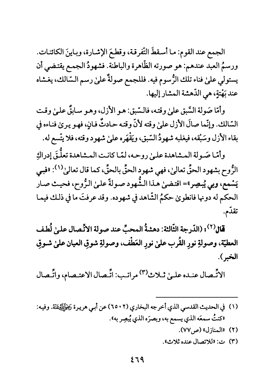 قال (¬٢): (الدّرجة الثّالثة: دهشةُ المحبِّ عند صولة الاتِّصال على لُطف العطيّة، وصولةِ نورِ القُرب على نورِ العَطْف، وصولةِ شوقِ العيان على شوقِ الخبر).