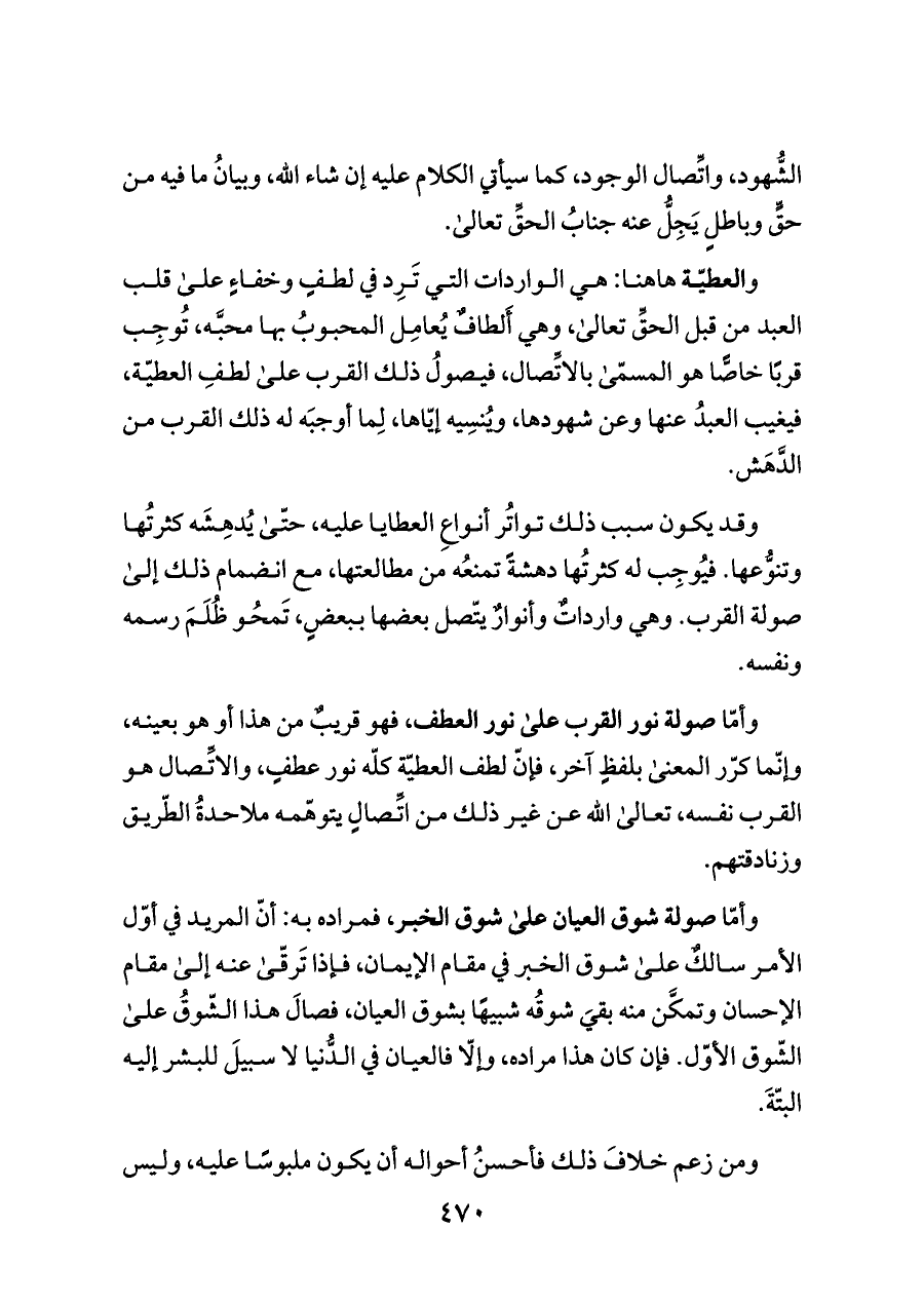 وقد يكون سبب ذلك تواتُر أنواعِ العطايا عليه، حتّى يُدهِشَه كثرتُها وتنوُّعها. فيُوجِب له كثرتُها دهشةً تمنعُه من مطالعتها، مع انضمام ذلك إلى صولة القرب. وهي وارداتٌ وأنوارٌ يتّصل بعضها ببعضٍ، تَمحُو ظُلَمَ رسمه ونفسه.