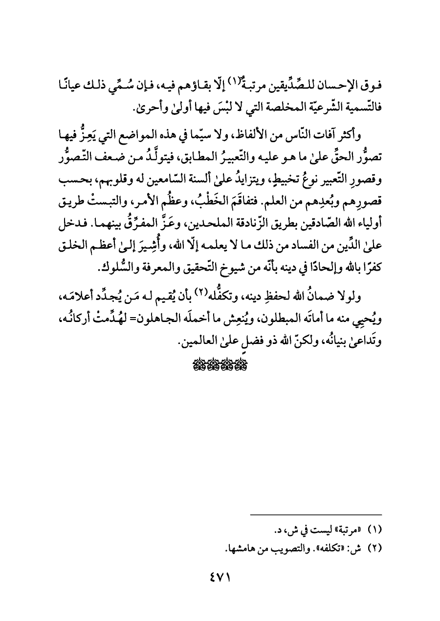 وأكثر آفات النّاس من الألفاظ، ولا سيّما في هذه المواضع التي يَعِزُّ فيها تصوُّر الحقِّ على ما هو عليه والتّعبيرُ المطابق، فيتولَّدُ من ضعف التّصوُّر وقصورِ التّعبير نوعُ تخبيطٍ، ويتزايدُ على ألسنة السّامعين له وقلوبهم، بحسب قصورِهم وبُعدِهم من العلم. فتفاقَمَ الخَطْبُ، وعظُم الأمر، والتبستْ طريق أولياء الله الصّادقين بطريق الزّنادقة الملحدين، وعَزَّ المفرِّقُ بينهما. فدخل على الدِّين من الفساد من ذلك ما لا يعلمه إلّا الله، وأُشِيرَ إلى أعظم الخلق كفرًا بالله وإلحادًا في دينه بأنّه من شيوخ التّحقيق والمعرفة والسُّلوك.