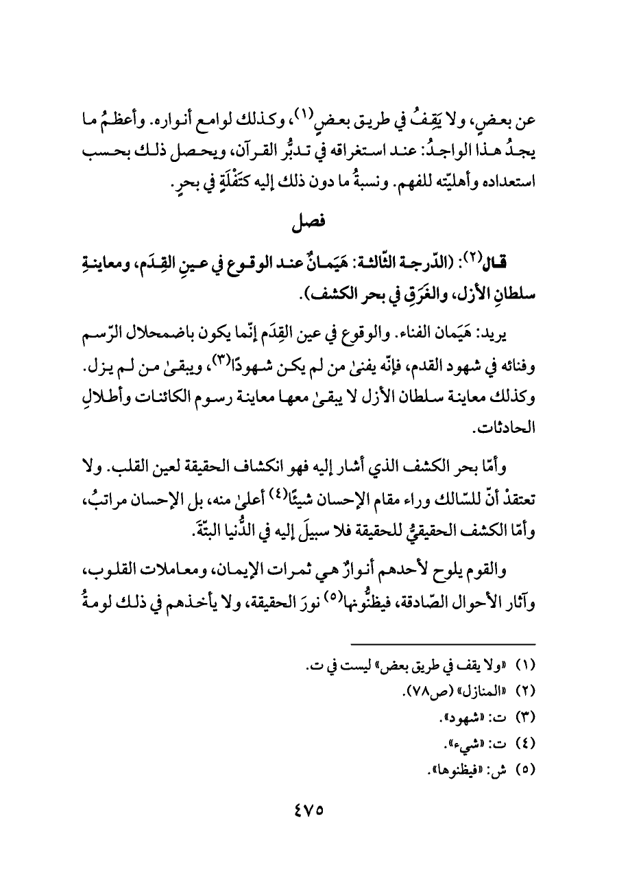 قال (¬٢): (الدّرجة الثّالثة: هَيَمانٌ عند الوقوع في عينِ القِدَم، ومعاينةِ سلطانِ الأزل، والغَرَقِ في بحر الكشف).