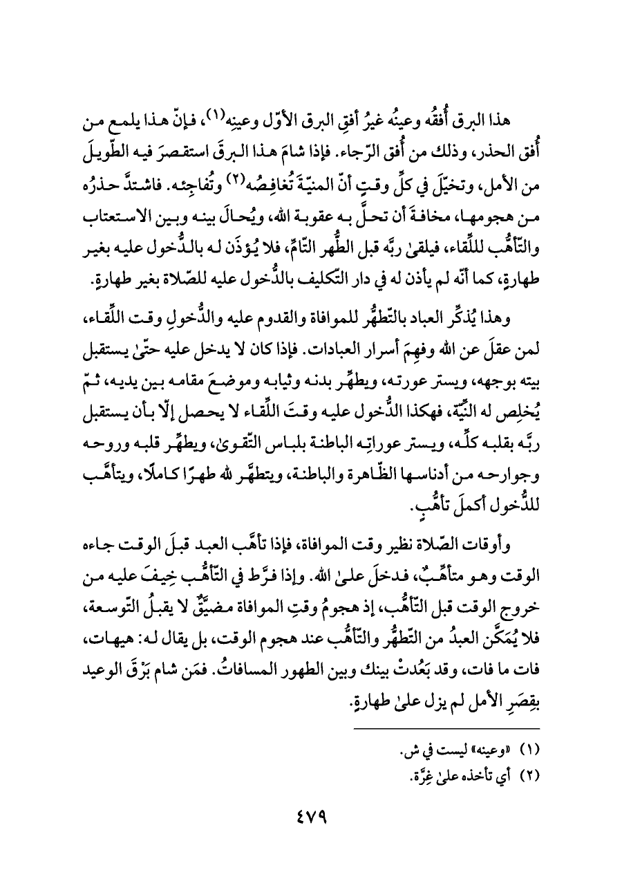 وأوقات الصّلاة نظير وقت الموافاة، فإذا تأهَّب العبد قبلَ الوقت جاءه الوقت وهو متأهِّبٌ، فدخلَ على الله. وإذا فرَّط في التّأهُّب خِيفَ عليه من خروج الوقت قبل التّأهُّب، إذ هجومُ وقتِ الموافاة مضيَّقٌ لا يقبلُ التّوسعة، فلا يُمَكَّن العبدُ من التّطهُّر والتّأهُّب عند هجوم الوقت، بل يقال له: هيهات، فات ما فات، وقد بَعُدتْ بينك وبين الطهور المسافاتُ. فمَن شام بَرْقَ الوعيد بقِصَرِ الأمل لم يزل على طهارةٍ.