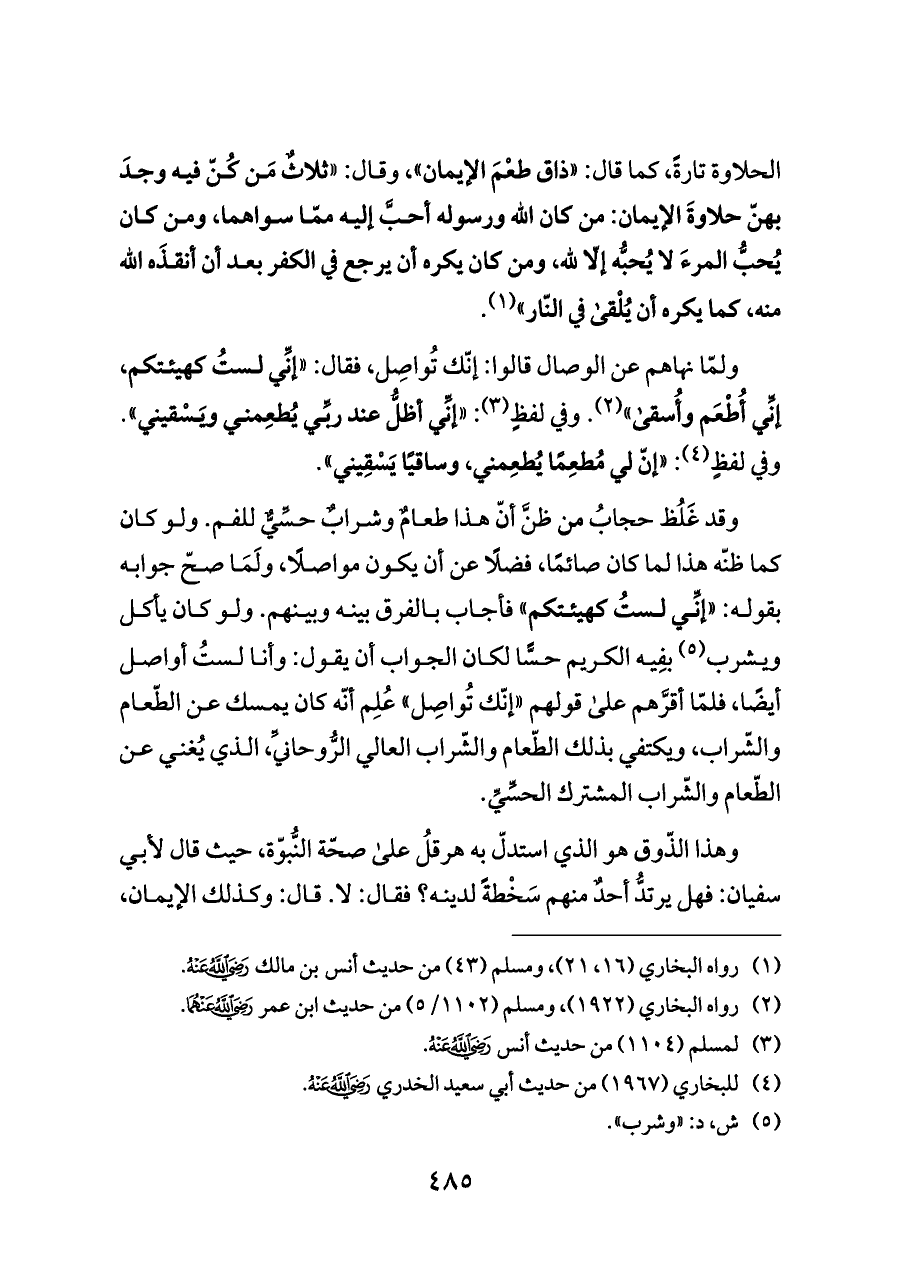 ولمّا نهاهم عن الوصال قالوا: إنّك تُواصِل، فقال: «إنِّي لستُ كهيئتكم، إنِّي أُطْعَم وأُسقى» (¬٢). وفي لفظٍ (¬٣): «إنِّي أظلُّ عند ربِّي يُطعِمني ويَسْقيني». وفي لفظٍ (¬٤): «إنّ لي مُطعِمًا يُطعِمني، وساقيًا يَسْقِيني».