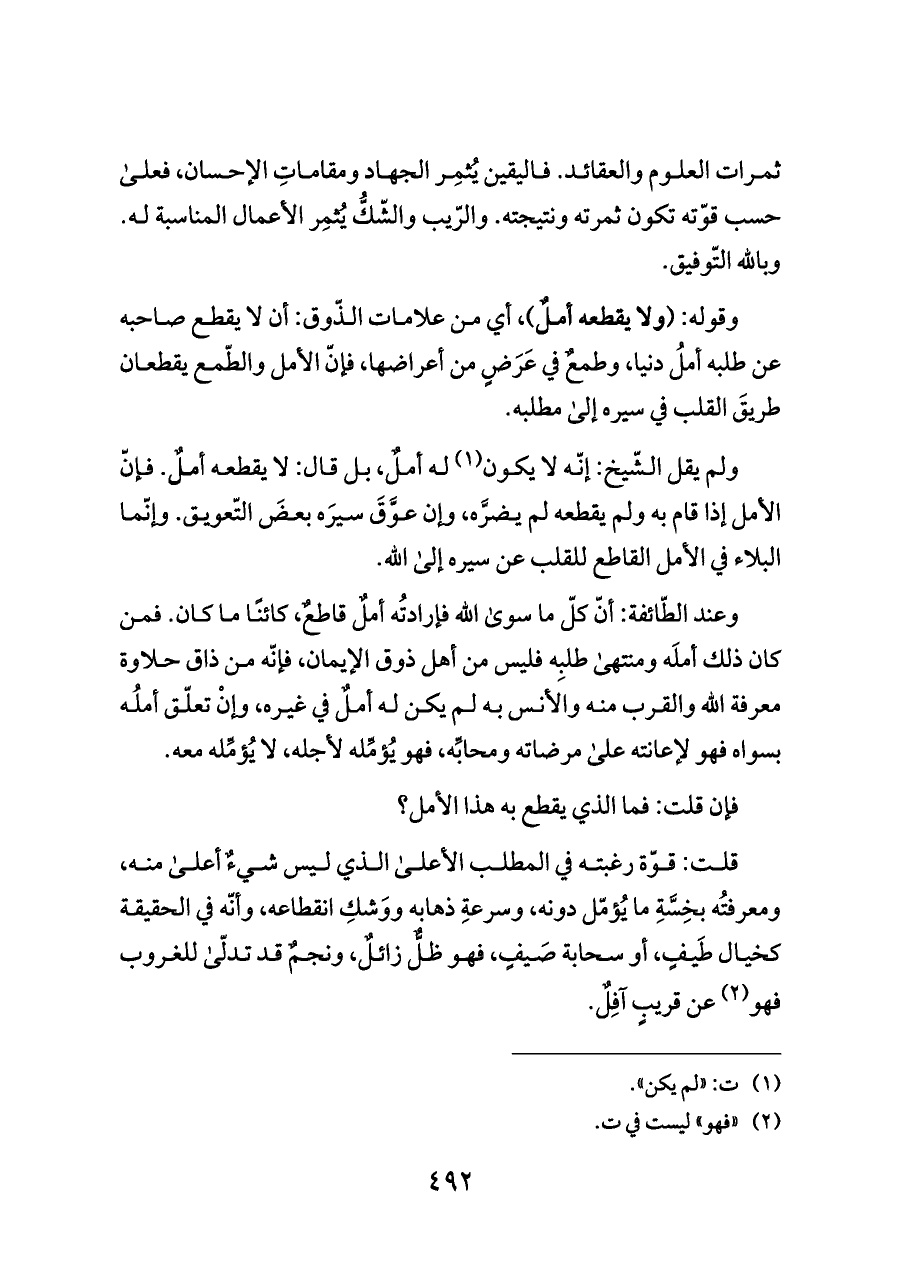 وعند الطّائفة: أنّ كلّ ما سوى الله فإرادتُه أملٌ قاطعٌ، كائنًا ما كان. فمن كان ذلك أملَه ومنتهى طلبِه فليس من أهل ذوق الإيمان، فإنّه من ذاق حلاوة معرفة الله والقرب منه والأنس به لم يكن له أملٌ في غيره، وإنْ تعلّق أملُه بسواه فهو لإعانته على مرضاته ومحابِّه، فهو يُؤمِّله لأجله، لا يُؤمِّله معه.