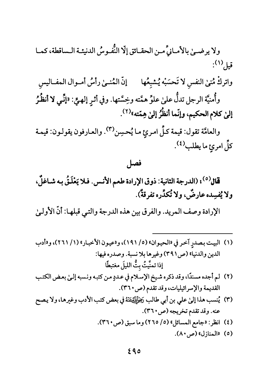 قال (¬٥): (الدرجة الثانية: ذوق الإرادة طعم الأنس. فلا يَعْلَقُ به شاغلٌ، ولا يُفسِده عارضٌ، ولا تُكدِّره تفرقةٌ).