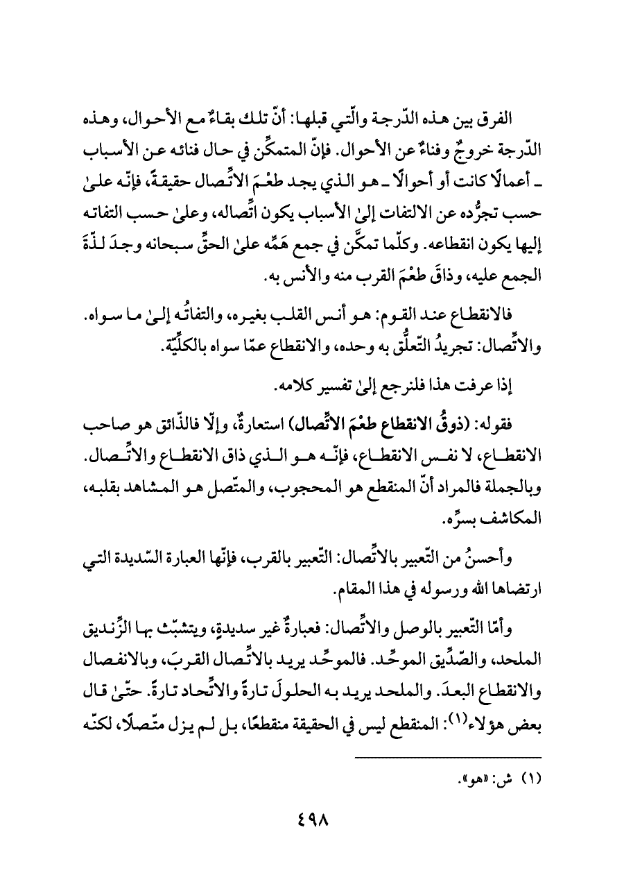 وأمّا التّعبير بالوصل والاتِّصال: فعبارةٌ غير سديدةٍ، ويتشبّث بها الزِّنديق الملحد، والصّدِّيق الموحِّد. فالموحِّد يريد بالاتِّصال القربَ، وبالانفصال والانقطاع البعدَ. والملحد يريد به الحلولَ تارةً والاتِّحاد تارةً. حتّى قال بعض هؤلاء (¬١): المنقطع ليس في الحقيقة منقطعًا، بل لم يزل متّصلًا، لكنّه