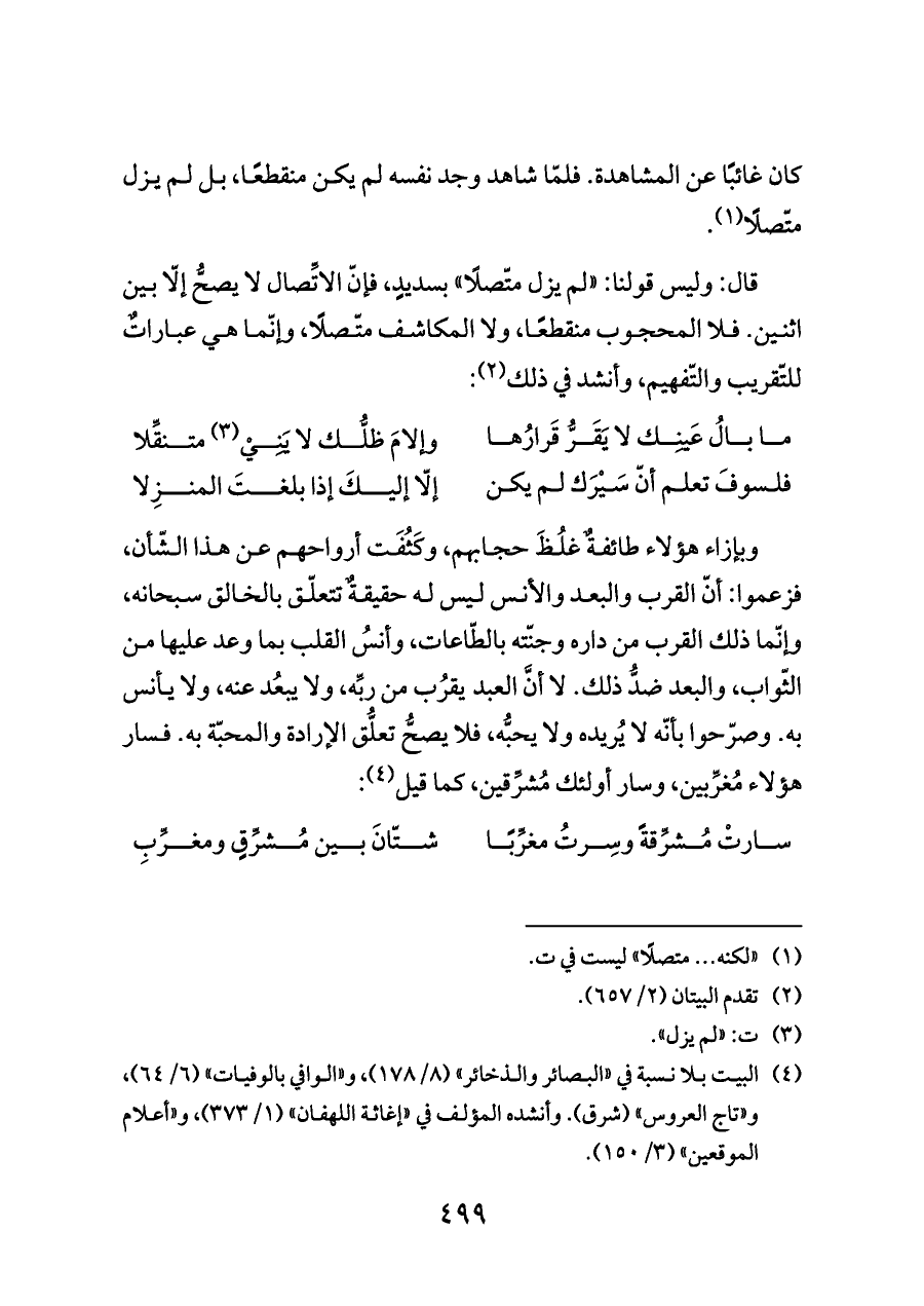 قال: وليس قولنا: «لم يزل متّصلًا» بسديدٍ، فإنّ الاتِّصال لا يصحُّ إلّا بين اثنين. فلا المحجوب منقطعًا، ولا المكاشف متّصلًا، وإنّما هي عباراتٌ للتّقريب والتّفهيم، وأنشد في ذلك (¬٢):