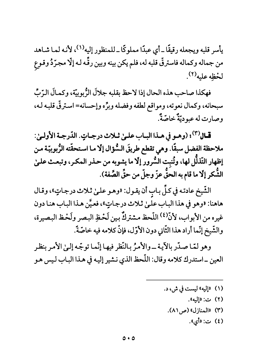 الشّيخ عادته في كلِّ بابٍ أن يقول: «وهو على ثلاث درجاتٍ»، وقال هاهنا: «وهو في هذا الباب على ثلاث درجاتٍ»، فعيَّن هذا الباب هنا دون غيره من الأبواب، لأنّ (¬٤) اللّحظ مشتركٌ بين لَحْظِ البصر ولَحْظ البصيرة، والشّيخ إنّما أراد هذا الثّاني دون الأوّل، فإنّ كلامه فيه خاصّةً.