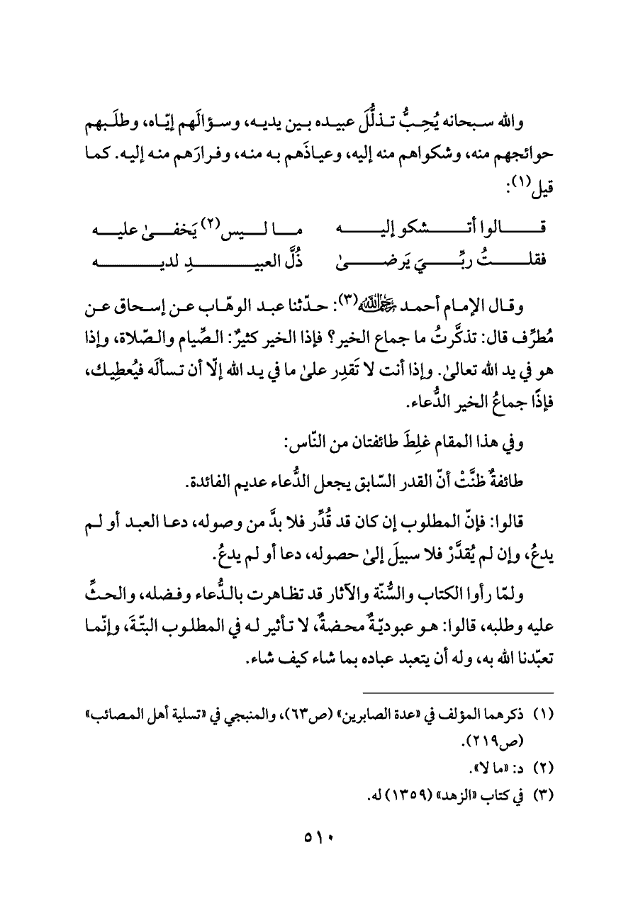 ولمّا رأوا الكتاب والسُّنّة والآثار قد تظاهرت بالدُّعاء وفضله، والحثِّ عليه وطلبه، قالوا: هو عبوديّةٌ محضةٌ، لا تأثير له في المطلوب البتّةَ، وإنّما تعبّدنا الله به، وله أن يتعبد عباده بما شاء كيف شاء.