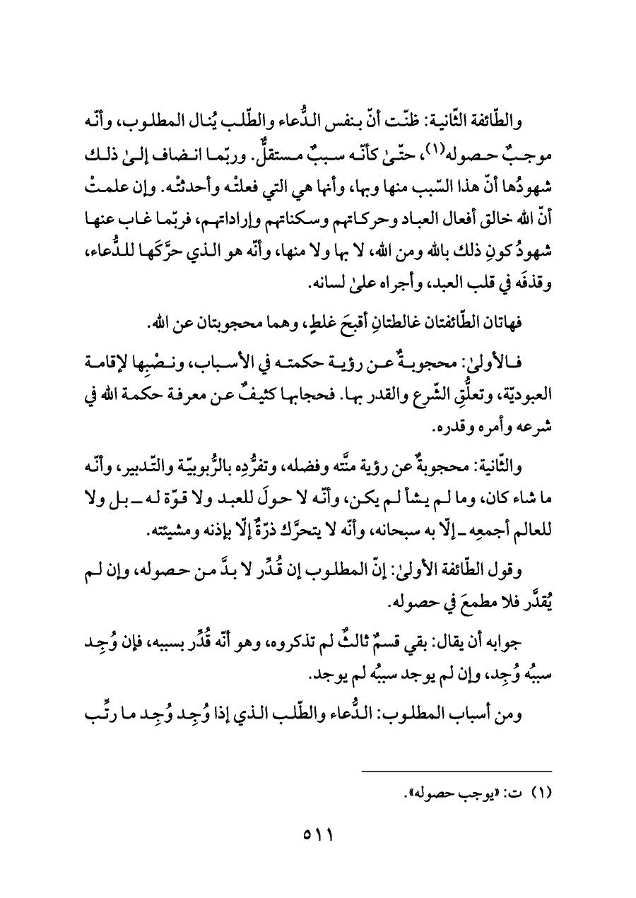 والطّائفة الثّانية: ظنّت أنّ بنفس الدُّعاء والطّلب يُنال المطلوب، وأنّه موجبٌ حصوله (¬١)، حتّى كأنّه سببٌ مستقلٌّ. وربّما انضاف إلى ذلك شهودُها أنّ هذا السّبب منها وبها، وأنها هي التي فعلتْه وأحدثتْه. وإن علمتْ أنّ الله خالق أفعال العباد وحركاتهم وسكناتهم وإراداتهم، فربّما غاب عنها شهودُ كونِ ذلك بالله ومن الله، لا بها ولا منها، وأنّه هو الذي حرَّكَها للدُّعاء، وقذفَه في قلب العبد، وأجراه على لسانه.