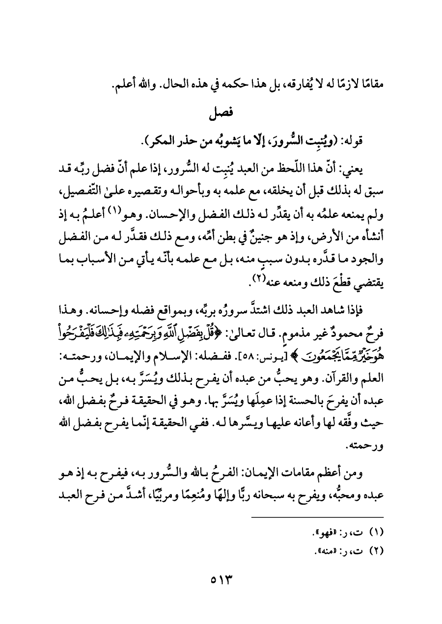 فإذا شاهد العبد ذلك اشتدَّ سرورُه بربِّه، وبمواقع فضله وإحسانه. وهذا فرحٌ محمودٌ غير مذمومٍ. قال تعالى: {(٥٧) قُلْ بِفَضْلِ اللَّهِ وَبِرَحْمَتِهِ فَبِذَلِكَ فَلْيَفْرَحُوا هُوَ خَيْرٌ مِمَّا} [يونس: ٥٨]. ففضله: الإسلام والإيمان، ورحمته: العلم والقرآن. وهو يحبُّ من عبده أن يفرح بذلك ويُسَرَّ به، بل يحبُّ من عبده أن يفرحَ بالحسنة إذا عمِلَها ويُسَرَّ بها. وهو في الحقيقة فرحٌ بفضل الله، حيث وفَّقه لها وأعانه عليها ويسَّرها له. ففي الحقيقة إنّما يفرح بفضل الله ورحمته.