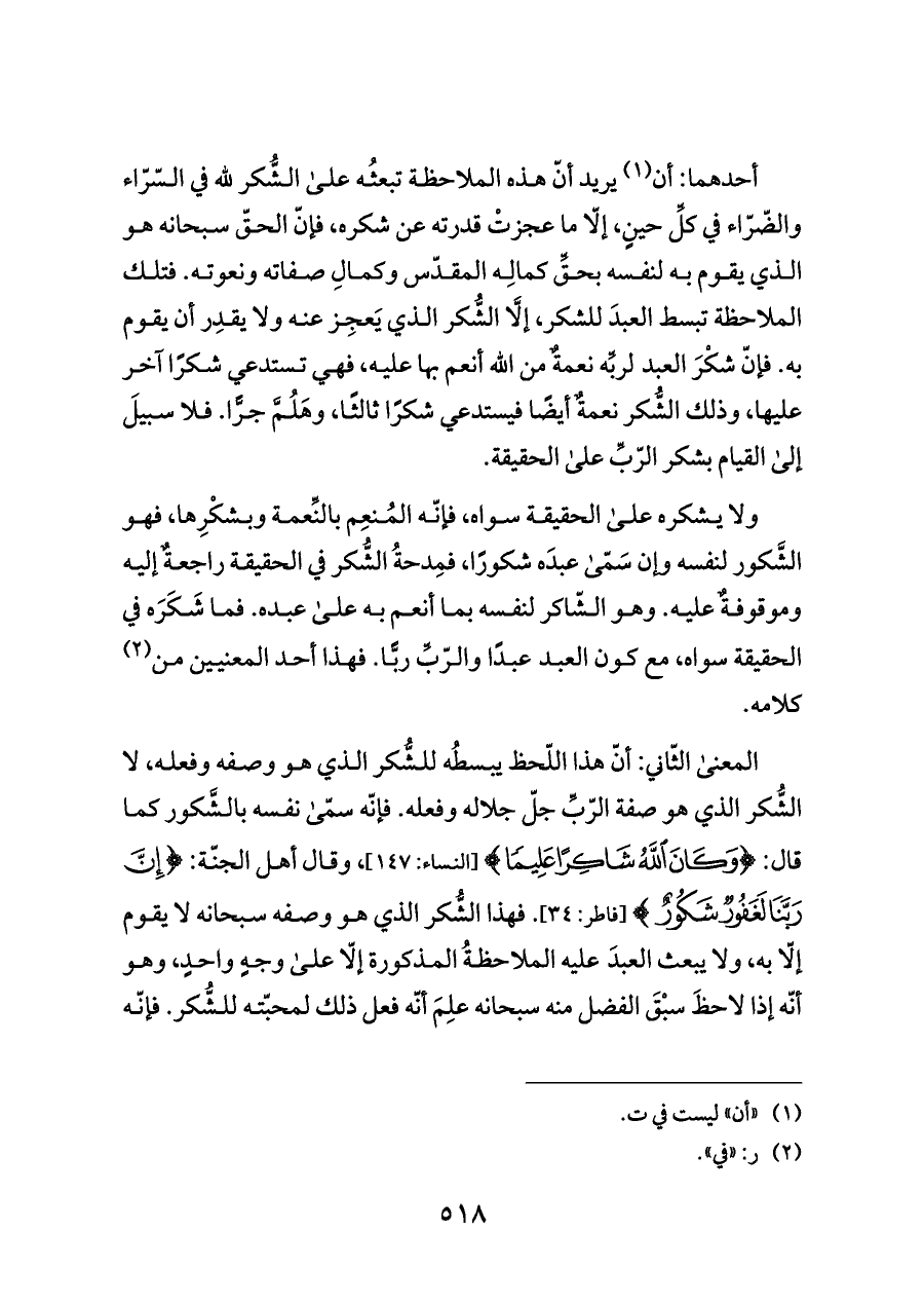 أحدهما: أن (¬١) يريد أنّ هذه الملاحظة تبعثُه على الشُّكر لله في السّرّاء والضّرّاء في كلِّ حينٍ، إلّا ما عجزتْ قدرته عن شكره، فإنّ الحقّ سبحانه هو الذي يقوم به لنفسه بحقِّ كمالِه المقدّس وكمالِ صفاته ونعوته. فتلك الملاحظة تبسط العبدَ للشكر، إلَّا الشُّكر الذي يَعجِز عنه ولا يقدِر أن يقوم به. فإنّ شكْرَ العبد لربِّه نعمةٌ من الله أنعم بها عليه، فهي تستدعي شكرًا آخر عليها، وذلك الشُّكر نعمةٌ أيضًا فيستدعي شكرًا ثالثًا، وهَلُمَّ جرًّا. فلا سبيلَ إلى القيام بشكر الرّبِّ على الحقيقة.