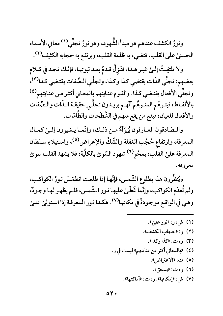 ويُنظِّرون هذا بطلوع الشّمس، فإنّها إذا طلعت انطمَسَ نورُ الكواكب، ولم تُعدَم الكواكب، وإنّما غَطّى عليها نور الشّمس، فلم يظهر لها وجودٌ، وهي في الواقع موجودةٌ في مكانها (¬٧). هكذا نور المعرفة إذا استولى على