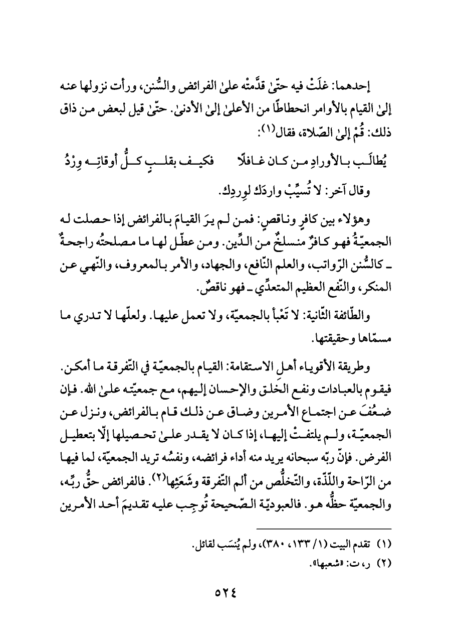 وهؤلاء بين كافرٍ وناقصٍ: فمن لم يرَ القيامَ بالفرائض إذا حصلت له الجمعيّةُ فهو كافرٌ منسلخٌ من الدِّين. ومن عطّل لها ما مصلحتُه راجحةٌ ــ كالسُّنن الرّواتب، والعلم النّافع، والجهاد، والأمر بالمعروف، والنّهي عن المنكر، والنّفع العظيم المتعدِّي ــ فهو ناقصٌ.