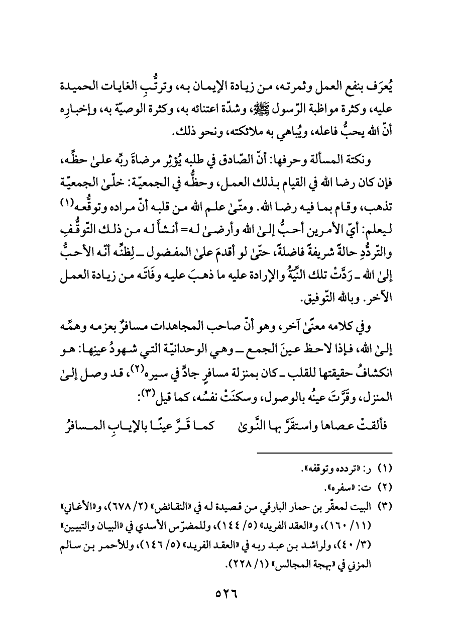 وفي كلامه معنًى آخر، وهو أنّ صاحب المجاهدات مسافرٌ بعزمه وهمِّه إلى الله، فإذا لاحظ عينَ الجمع ــ وهي الوحدانيّة التي شهودُ عينِها: هو انكشافُ حقيقتها للقلب ــ كان بمنزلة مسافرٍ جادٍّ في سيره (¬٢)، قد وصل إلى المنزل، وقَرَّتَ عينُه بالوصول، وسكنَتْ نفسُه، كما قيل (¬٣):
