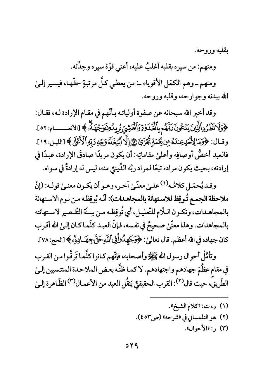 ومنهم ــ وهم الكمّل الأقوياء ــ: من يعطي كلَّ مرتبةٍ حقّها، فيسير إلى الله ببدنه وجوارحه، وقلبه وروحه.