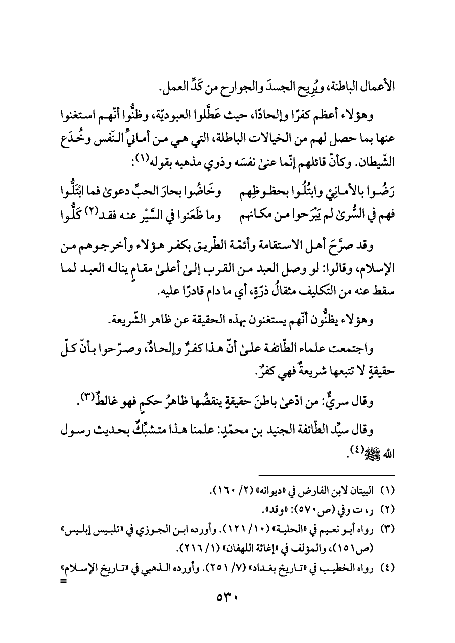 وقد صرَّحَ أهل الاستقامة وأئمّة الطّريق بكفر هؤلاء وأخرجوهم من الإسلام، وقالوا: لو وصل العبد من القرب إلى أعلى مقامٍ يناله العبد لما سقط عنه من التّكليف مثقالُ ذرّةٍ، أي ما دام قادرًا عليه.