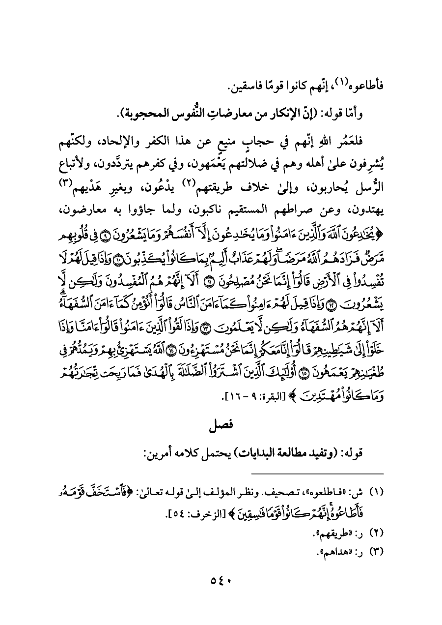 فلعَمُر اللهِ إنّهم في حجابٍ منيعٍ عن هذا الكفر والإلحاد، ولكنّهم يُشرِفون على أهله وهم في ضلالتهم يَعْمَهون، وفي كفرهم يتردَّدون، ولأتباع الرُّسل يُحاربون، وإلى خلاف طريقتهم (¬٢) يدْعُون، وبغيرِ هَدْيهم (¬٣) يهتدون، وعن صراطهم المستقيم ناكبون، ولما جاؤوا به معارضون، {يُخَادِعُونَ اللَّهَ وَالَّذِينَ آمَنُوا وَمَا يُخَادِعُونَ إِلَّا أَنْفُسَهُمْ وَمَا يَشْعُرُونَ (٩) فِي قُلُوبِهِمْ مَرَضٌ فَزَادَهُمُ اللَّهُ مَرَضًا وَلَهُمْ عَذَابٌ أَلِيمٌ بِمَا كَانُوا يُكَذِّبُونَ (١٠) وَإِذَا قِيلَ لَهُمْ لَا تُفْسِدُوا فِي الْأَرْضِ قَالُوا إِنَّمَا نَحْنُ مُصْلِحُونَ (١١) أَلَا إِنَّهُمْ هُمُ الْمُفْسِدُونَ وَلَكِنْ لَا يَشْعُرُونَ (١٢) وَإِذَا قِيلَ لَهُمْ آمِنُوا كَمَا آمَنَ النَّاسُ قَالُوا أَنُؤْمِنُ كَمَا آمَنَ السُّفَهَاءُ أَلَا إِنَّهُمْ هُمُ السُّفَهَاءُ وَلَكِنْ لَا يَعْلَمُونَ (١٣) وَإِذَا لَقُوا الَّذِينَ آمَنُوا قَالُوا آمَنَّا وَإِذَا خَلَوْا إِلَى شَيَاطِينِهِمْ قَالُوا إِنَّا مَعَكُمْ إِنَّمَا نَحْنُ مُسْتَهْزِئُونَ (١٤) اللَّهُ يَسْتَهْزِئُ بِهِمْ وَيَمُدُّهُمْ فِي طُغْيَانِهِمْ يَعْمَهُونَ (١٥) أُولَئِكَ الَّذِينَ اشْتَرَوُا الضَّلَالَةَ بِالْهُدَى فَمَا رَبِحَتْ تِجَارَتُهُمْ وَمَا كَانُوا مُهْتَدِينَ} [البقرة: ٩ - ١٦].