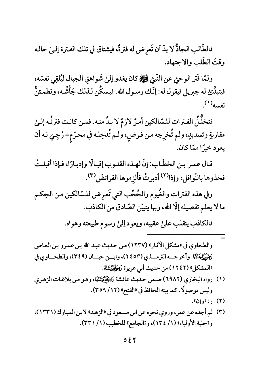 فتخلُّلُ الفترات للسّالكين أمرٌ لازمٌ لا بدَّ منه. فمن كانت فترتُه إلى مقاربةٍ وتسديدٍ، ولم تُخرِجه من فرضٍ، ولم تُدخِله في محرّمٍ= رُجِيَ له أن يعود خيرًا ممّا كان.