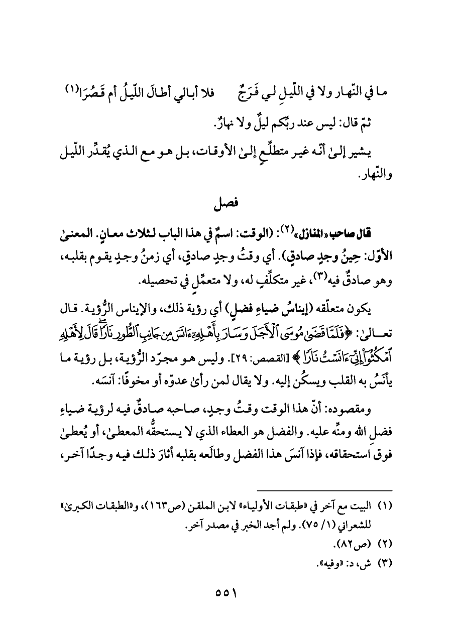 قال صاحب «المنازل» (¬٢): (الوقت: اسمٌ في هذا الباب لثلاث معانٍ. المعنى الأوّل: حِينُ وجدٍ صادقٍ). أي وقتُ وجدٍ صادقٍ، أي زمنُ وجدٍ يقوم بقلبه، وهو صادقٌ فيه (¬٣)، غير متكلِّفٍ له، ولا متعمِّلٍ في تحصيله.