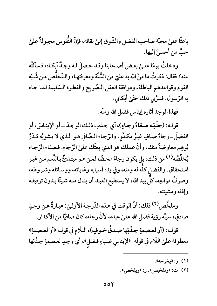 قوله: (جذَبَه صفاءُ رجاءٍ)، أي جذب ذلك الوجدَ ــ أو الإيناسَ، أو الفضلَ ــ رجاءٌ صافٍ غيرُ مكدَّرٍ. والرّجاء الصّافي هو الذي لا يشوبُه كدَرٌ يُوهِم معاوضةً منك، وأنّ عملك هو الذي بعثَك على الرّجاء. فصفاء الرّجاء يُخلِّصُه (¬١) من ذلك، بل يكون رجاءً محضًا لمن هو مبتدئٌ بالنِّعم من غير استحقاق. والفضل كلُّه له ومنه، وفي يده أسبابه وغاياته، ووسائله وشروطه، وصرفُ موانعِه، كلٌّ بيد الله، لا يستطيع العبد أن ينال منه شيئًا بدون توفيقه وإذنه ومشيئته.