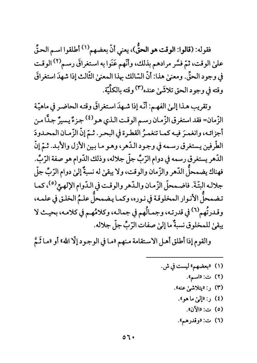 فقوله: (قالوا: الوقت هو الحقُّ) , يعني أنّ بعضهم (¬١) أطلقوا اسم الحقِّ على الوقت، ثمّ فسَّر مرادهم بذلك, وأنّهم عَنَوا به استغراقَ رسم (¬٢) الوقت في وجود الحقِّ. ومعنى هذا: أنّ السّالك بهذا المعنى الثّالث إذا شهدَ استغراقَ وقته في وجود الحق تلاشَى عنده (¬٣) وقته بالكلِّيّة.