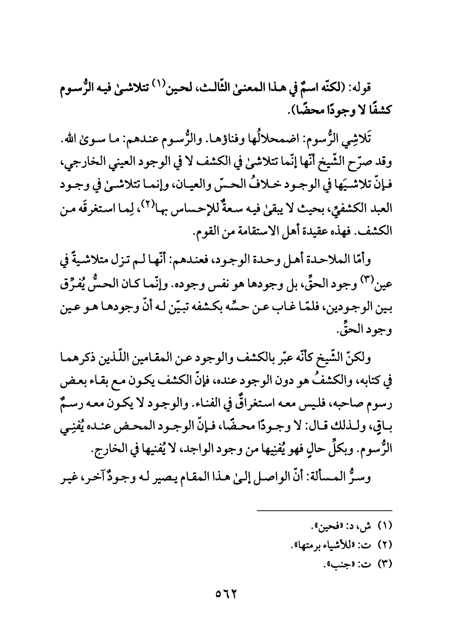 تَلاشِي الرُّسوم: اضمحلالُها وفناؤها. والرُّسوم عندهم: ما سوى الله. وقد صرّح الشّيخ أنّها إنّما تتلاشى في الكشف لا في الوجود العيني الخارجي، فإنّ تلاشيَها في الوجود خلافُ الحسّ والعيان، وإنما تتلاشى في وجود العبد الكشفيِّ، بحيث لا يبقى فيه سعةٌ للإحساس بها (¬٢)، لِما استغرقَه من الكشف. فهذه عقيدة أهل الاستقامة من القوم.
