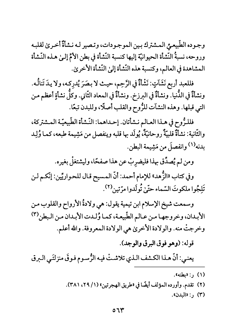 وجوده الطّبيعيِّ المشترك بين الموجودات، وتصير له نشأةٌ أخرى لقلبه وروحه، نسبةُ النّشأة الحيوانيّة إليها كنسبة النّشأة في بطن الأمِّ إلى هذه النّشأة المشاهدة في العالم، وكنسبة هذه النّشأة إلى النّشأة الأخرى.