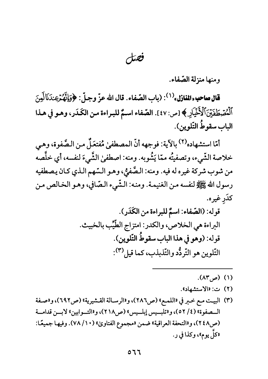 قال صاحب «المنازل» (¬١): (باب الصّفاء. قال الله عزّ وجلّ: {(٤٦) وَإِنَّهُمْ عِنْدَنَا لَمِنَ الْمُصْطَفَيْنَ} [ص: ٤٧]. الصّفاء اسمٌ للبراءة من الكَدَر، وهو في هذا الباب سقوطُ التّلوين).