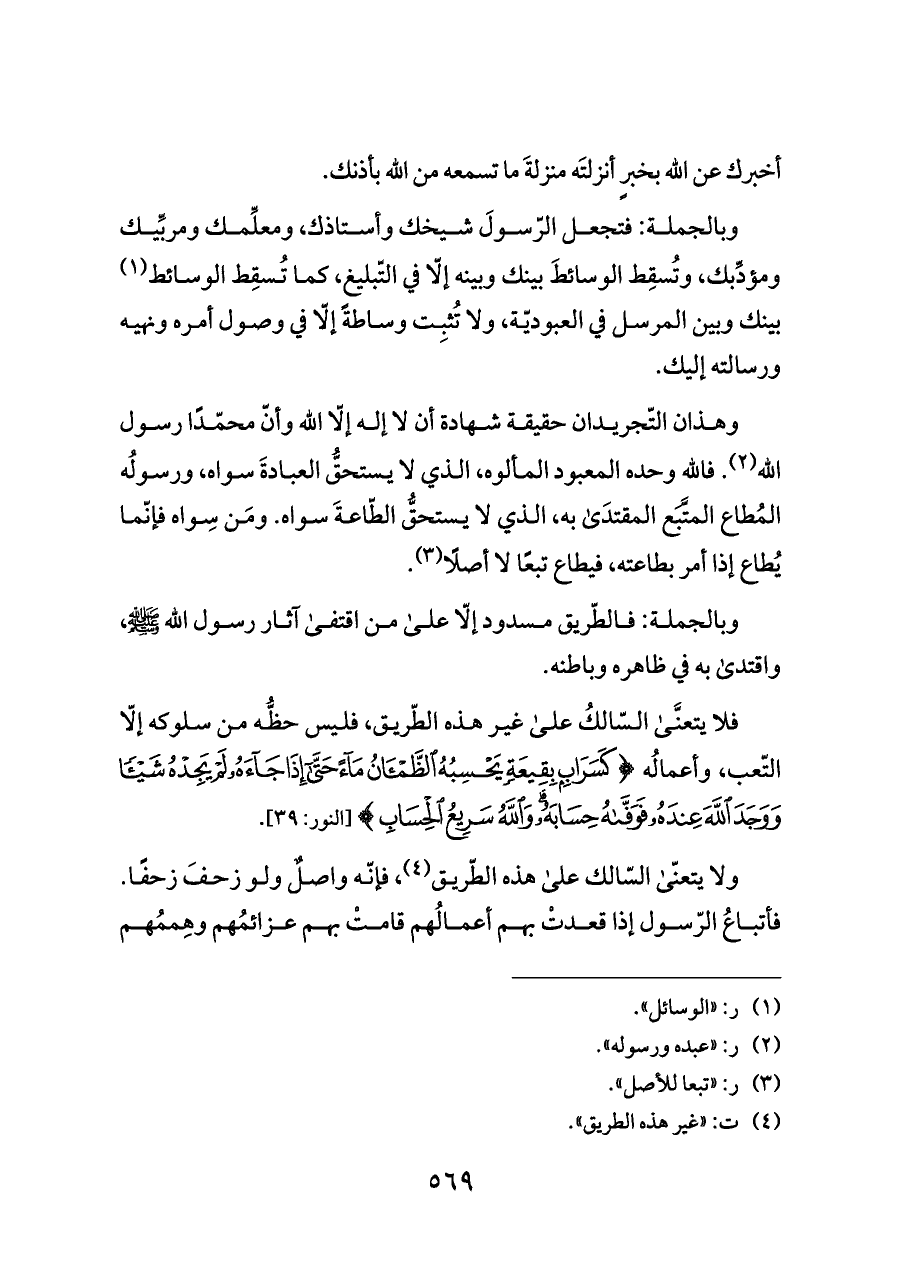 وبالجملة: فتجعل الرّسولَ شيخك وأستاذك، ومعلِّمك ومربِّيك ومؤدِّبك، وتُسقِط الوسائطَ بينك وبينه إلّا في التّبليغ، كما تُسقِط الوسائط (¬١) بينك وبين المرسل في العبوديّة، ولا تُثبِت وساطةً إلّا في وصول أمره ونهيه ورسالته إليك.