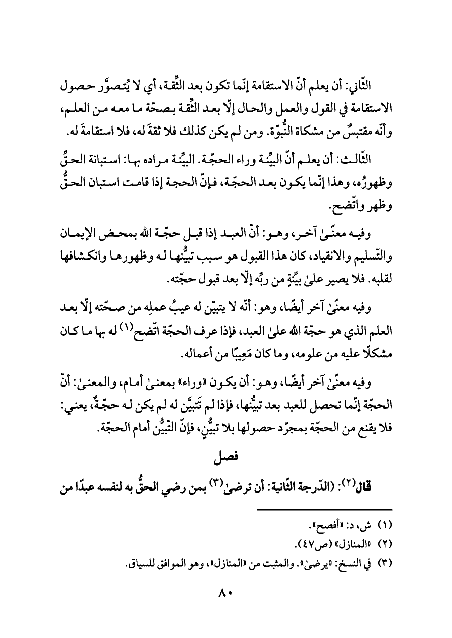 الثّاني: أن يعلم أنّ الاستقامة إنّما تكون بعد الثِّقة، أي لا يُتصوَّر حصول الاستقامة في القول والعمل والحال إلّا بعد الثِّقة بصحّة ما معه من العلم، وأنّه مقتبسٌ من مشكاة النُّبوّة. ومن لم يكن كذلك فلا ثقةَ له، فلا استقامةَ له.