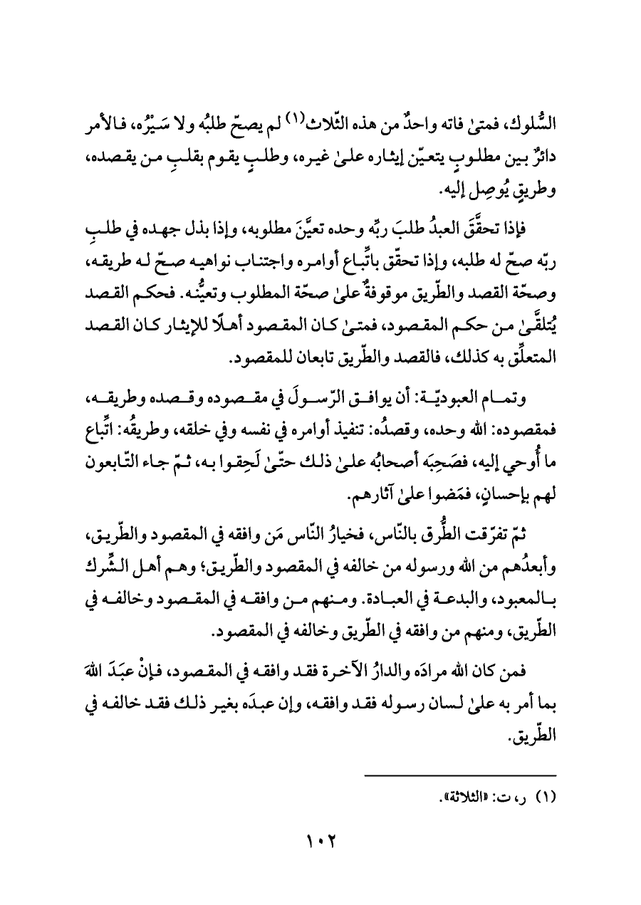 فإذا تحقَّقَ العبدُ طلبَ ربِّه وحده تعيَّنَ مطلوبه، وإذا بذل جهده في طلبِ ربّه صحّ له طلبه، وإذا تحقّق باتِّباع أوامره واجتناب نواهيه صحّ له طريقه، وصحّة القصد والطّريق موقوفةٌ على صحّة المطلوب وتعيُّنه. فحكم القصد يُتلقَّى من حكم المقصود، فمتى كان المقصود أهلًا للإيثار كان القصد المتعلِّق به كذلك، فالقصد والطّريق تابعان للمقصود.