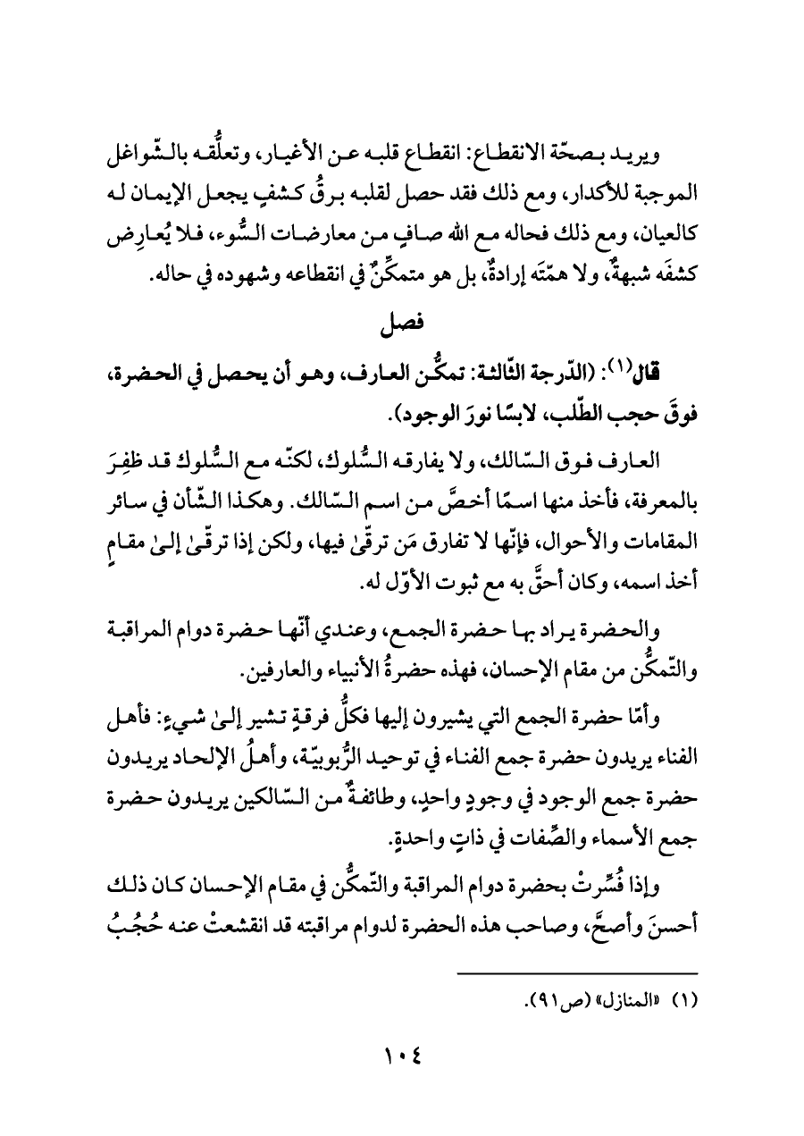 قال (¬١): (الدّرجة الثّالثة: تمكُّن العارف، وهو أن يحصل في الحضرة، فوقَ حجب الطّلب، لابسًا نورَ الوجود).
