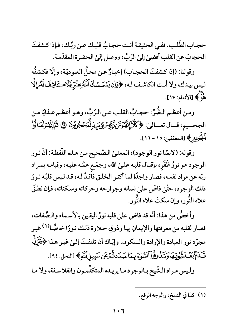 وقوله: (لابسًا نور الوجود)، المعنى الصّحيح من هذه اللّفظة: أنّ نور الوجود هو نورُ ظَفَرِه بإقبال قلبه على الله، وجمْعِ همِّه عليه، وقيامه بمراد ربّه عن مراد نفسه، فصار واجدًا لما أكثر الخلق فاقدٌ له، قد لبس قلبُه نورَ ذلك الوجود، حتّى فاضَ على لسانه وجوارحه وحركاته وسكناته، فإن نطقَ علاه النُّور، وإن سكتَ علاه النُّور.