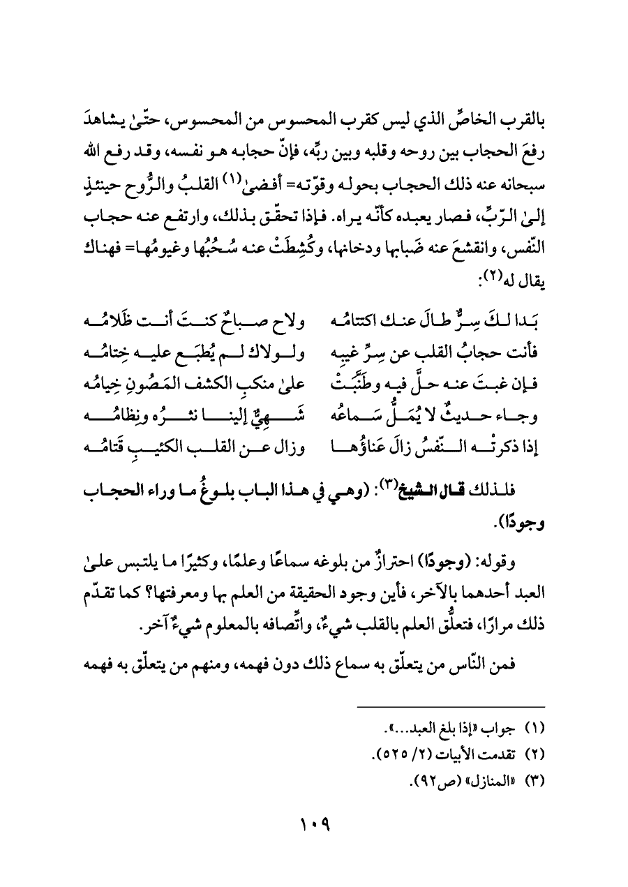 بالقرب الخاصِّ الذي ليس كقرب المحسوس من المحسوس، حتّى يشاهدَ رفعَ الحجاب بين روحه وقلبه وبين ربِّه، فإنّ حجابه هو نفسه، وقد رفع الله سبحانه عنه ذلك الحجاب بحوله وقوّته= أفضى (¬١) القلبُ والرُّوح حينئذٍ إلى الرّبِّ، فصار يعبده كأنّه يراه. فإذا تحقّق بذلك، وارتفع عنه حجاب النّفس، وانقشعَ عنه ضَبابها ودخانها، وكُشِطَتْ عنه سُحُبُها وغيومُها= فهناك يقال له (¬٢):