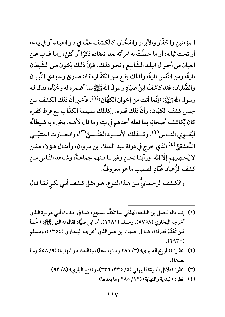 المؤمنين والكفّار والأبرار والفجَّار، كالكشف عمَّا في دار العبد، أو في يده، أو تحت ثيابه، أو ما حملَتْ به امرأته بعد انعقاده ذكرًا أو أنثى، وما غاب عن العيان من أحوال البلد الشّاسع ونحو ذلك، فإنّ ذلك يكون من الشّيطان تارةً، ومن النّفس تارةً، ولذلك يقع من الكفّار، كالنصارى وعابدي النِّيران والصُّلبان، فقد كاشفَ ابنُ صيّادٍ رسولَ الله - صلى الله عليه وسلم - بما أضمره له وخَبَأه، فقال له رسول الله - صلى الله عليه وسلم -: «إنّما أنت من إخوان الكهَّان» (¬١). فأخبر أنّ ذلك الكشف من جنس كشف الكهّان، وأنّ ذلك قدره. وكذلك مسيلمة الكذّاب مع فرط كفره كان يُكاشف أصحابَه بما فعله أحدهم في بيته وما قال لأهله، يخبره به شيطانُه ليُغوِي الناس (¬٢). وكذلك الأسود العَنْسيُّ (¬٣)، والحارث المتنبِّي الدِّمشقيُّ (¬٤) الذي خرج في دولة عبد الملك بن مروان، وأمثال هؤلاء ممّن لا يُحصِيهم إلّا الله. ورأينا نحن وغيرنا منهم جماعةً، وشاهد النّاس من كشف الرُّهبان عُبّادِ الصليب ما هو معروفٌ.