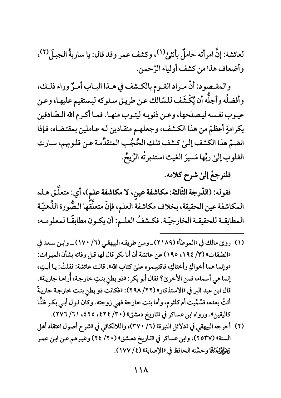 فقوله: (الدّرجة الثّالثة: مكاشفة عينٍ، لا مكاشفة علمٍ)، أي: متعلَّق هذه المكاشفة عين الحقيقة، بخلاف مكاشفة العلم، فإنّ متعلَّقها الصُّورة الذِّهنيّة المطابقة للحقيقة الخارجيّة. فكشفُ العلم: أن يكون مطابقًا لمعلومه،