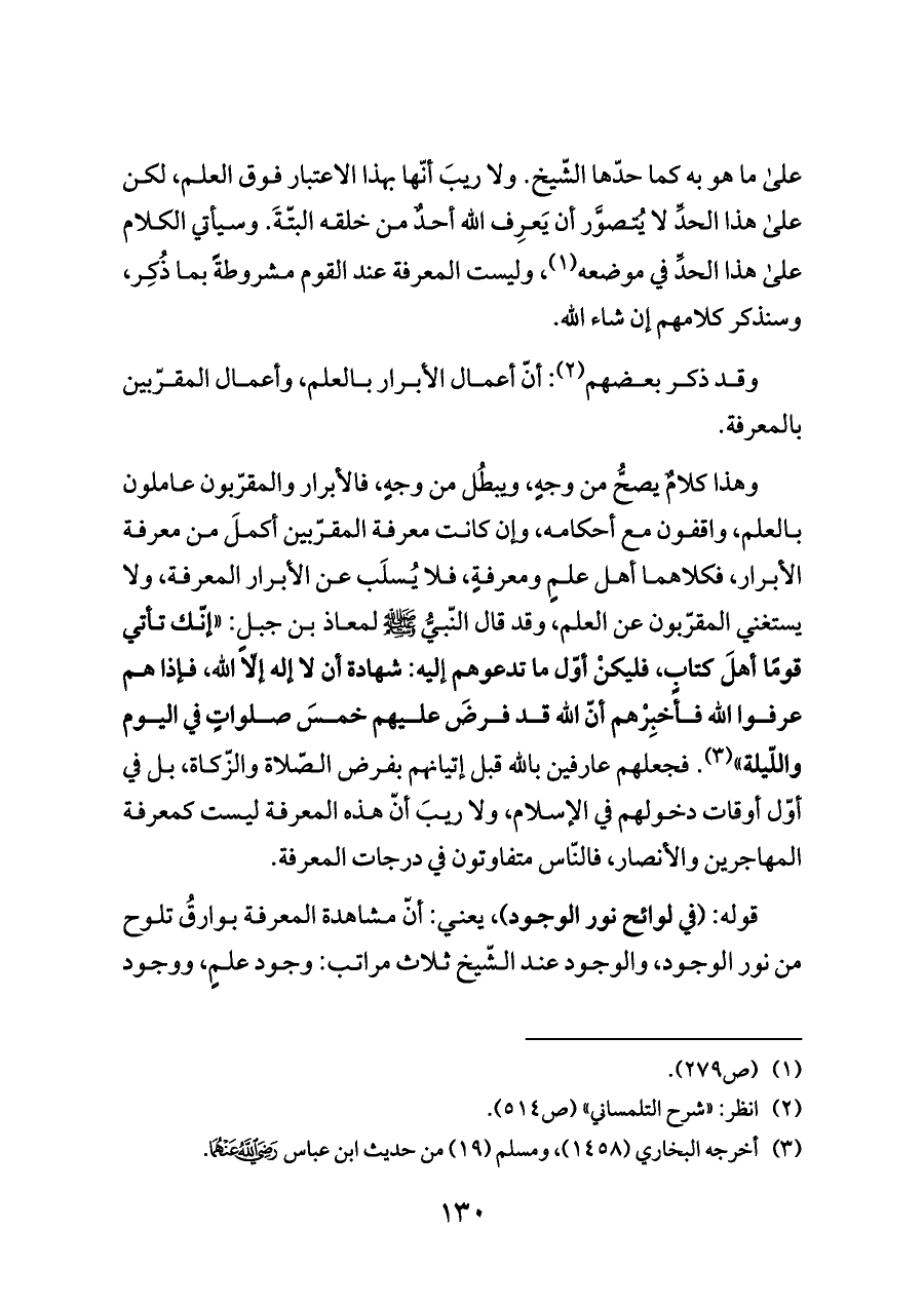 وهذا كلامٌ يصحُّ من وجهٍ، ويبطُل من وجهٍ، فالأبرار والمقرّبون عاملون بالعلم، واقفون مع أحكامه، وإن كانت معرفة المقرّبين أكملَ من معرفة الأبرار، فكلاهما أهل علمٍ ومعرفةٍ، فلا يُسلَب عن الأبرار المعرفة، ولا يستغني المقرّبون عن العلم، وقد قال النّبيُّ - صلى الله عليه وسلم - لمعاذ بن جبلٍ: «إنّك تأتي قومًا أهلَ كتابٍ، فليكنْ أوّل ما تدعوهم إليه: شهادة أن لا إله إلّا الله، فإذا هم عرفوا الله فأخبِرْهم أنّ الله قد فرضَ عليهم خمسَ صلواتٍ في اليوم واللّيلة» (¬٣). فجعلهم عارفين بالله قبل إتيانهم بفرض الصّلاة والزّكاة، بل في أوّل أوقات دخولهم في الإسلام، ولا ريبَ أنّ هذه المعرفة ليست كمعرفة المهاجرين والأنصار، فالنّاس متفاوتون في درجات المعرفة.
