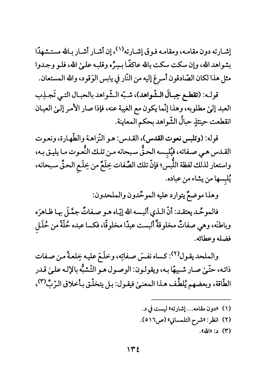والملحد يقول (¬٢): كساه نفسَ صفاتِه، وخلَعَ عليه خِلعةً من صفات ذاته، حتّى صار شبيهًا به، ويقولون: الوصول هو التّشبُّه بالإله على قدر الطّاقة، وبعضهم يُلطِّف هذا المعنى فيقول: بل يتخلّق بأخلاق الرّبِّ (¬٣)،