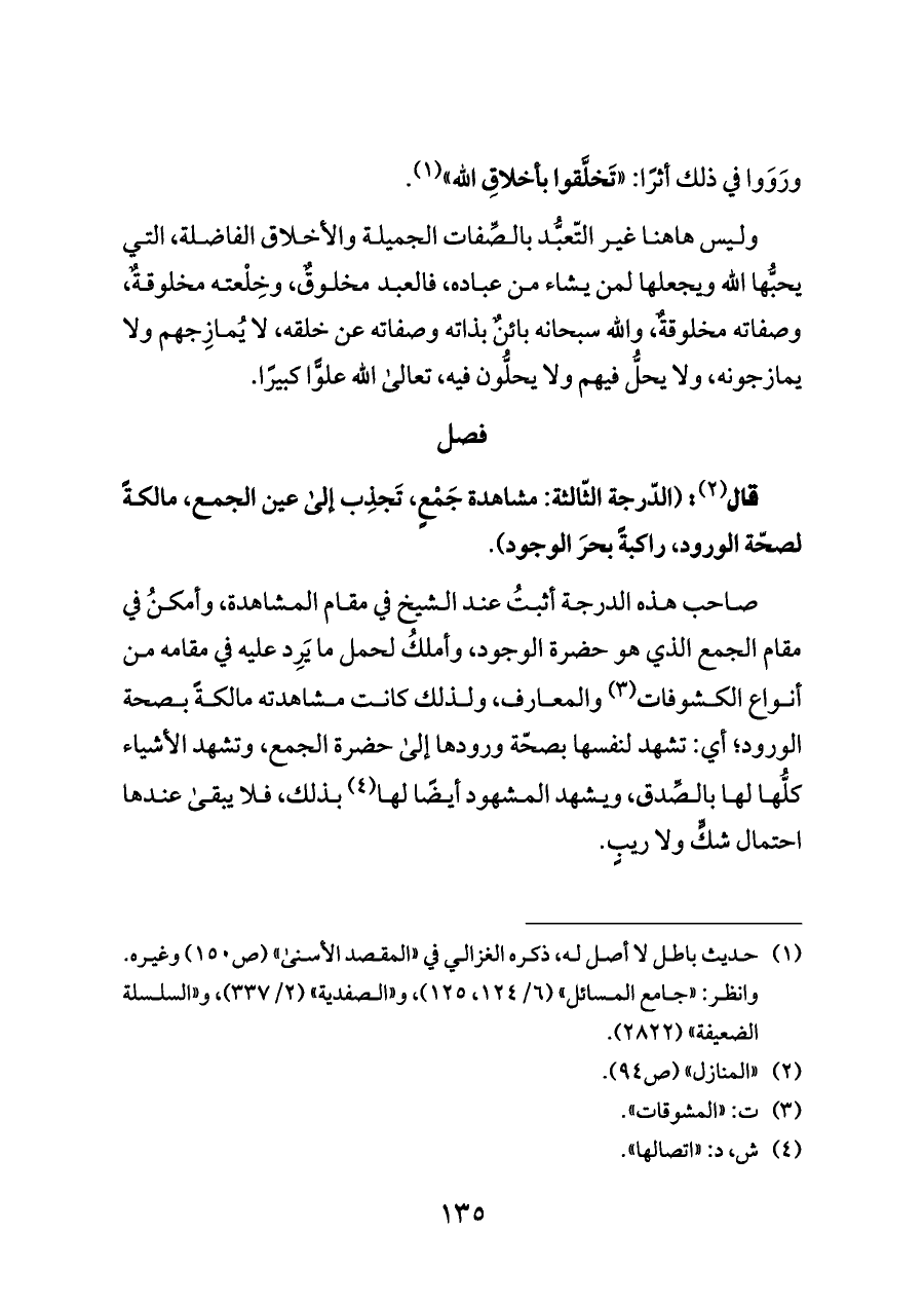 قال (¬٢): (الدّرجة الثّالثة: مشاهدة جَمْعٍ، تَجذِب إلى عين الجمع، مالكةً لصحّة الورود، راكبةً بحرَ الوجود).