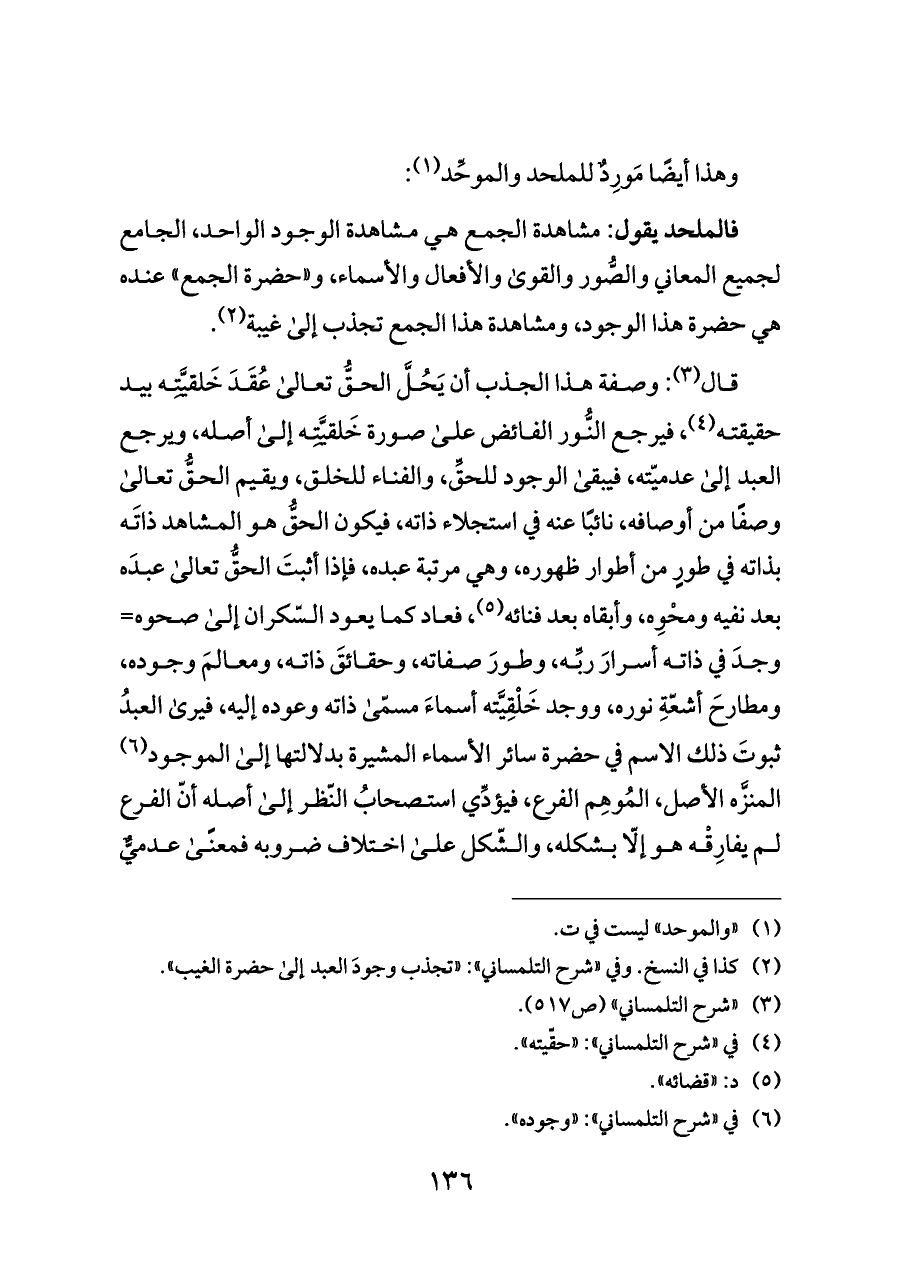 فالملحد يقول: مشاهدة الجمع هي مشاهدة الوجود الواحد، الجامع لجميع المعاني والصُّور والقوى والأفعال والأسماء، و «حضرة الجمع» عنده هي حضرة هذا الوجود، ومشاهدة هذا الجمع تجذب إلى غيبة (¬٢).