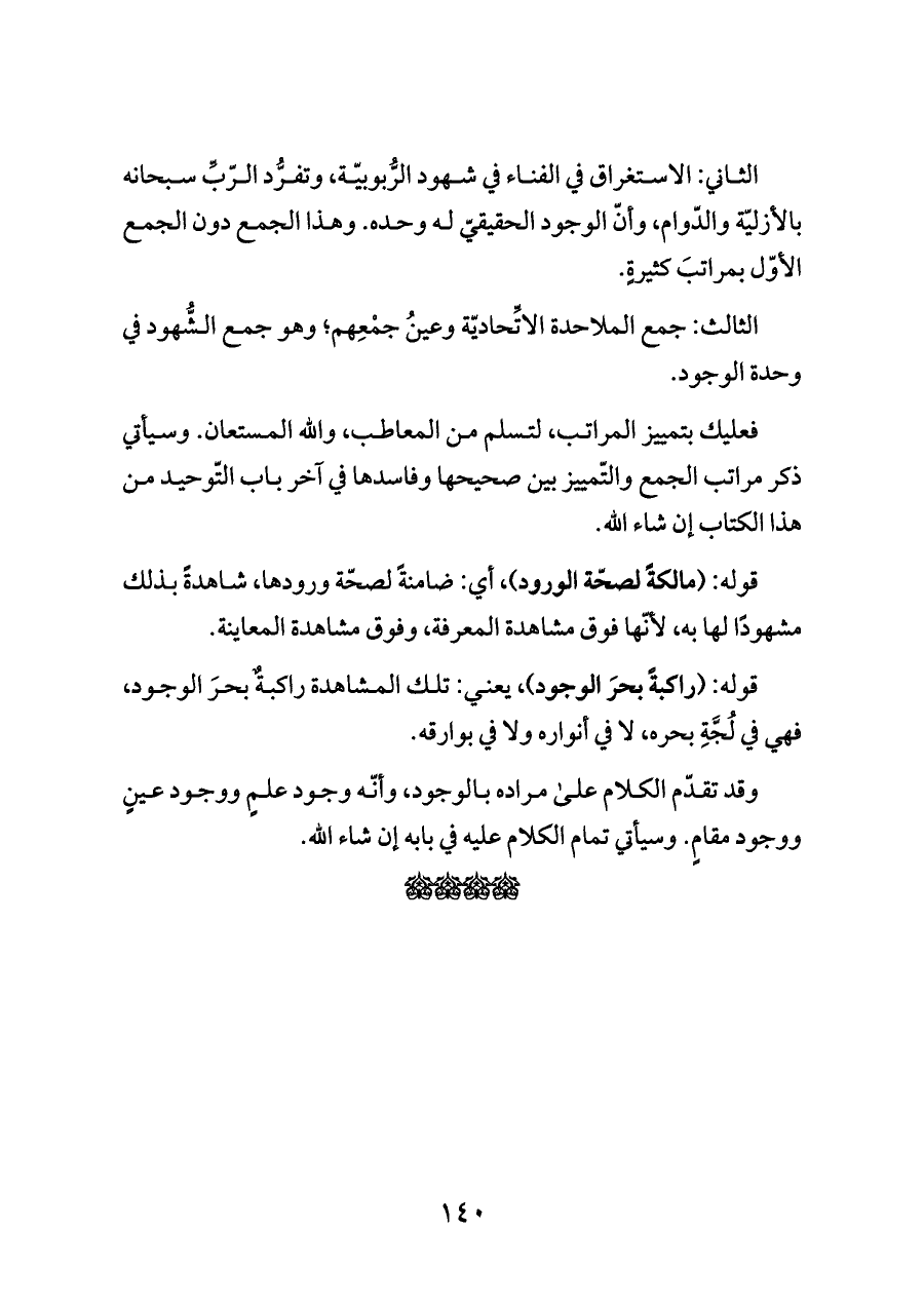 الثاني: الاستغراق في الفناء في شهود الرُّبوبيّة، وتفرُّد الرّبِّ سبحانه بالأزليّة والدّوام، وأنّ الوجود الحقيقيّ له وحده. وهذا الجمع دون الجمع الأوّل بمراتبَ كثيرةٍ.