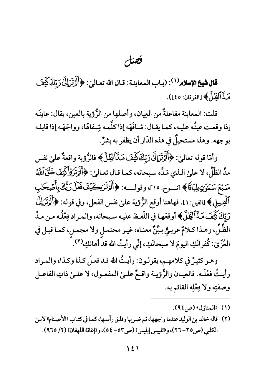 قال شيخ الإسلام (¬١): (باب المعاينة: قال الله تعالى: {(٤٤) أَلَمْ تَرَ إِلَى رَبِّكَ كَيْفَ مَدَّ} [الفرقان: ٤٥]).