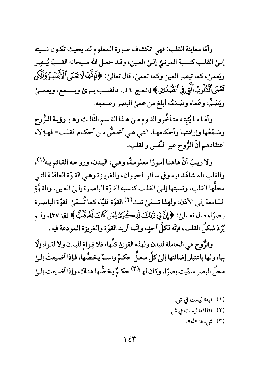 وأمّا ما يُثبِته متأخِّرو القوم من هذا القسم الثّالث وهو رؤية الرُّوح وسَمْعُها وإرادتها وأحكامها، التي هي أخصُّ من أحكام القلب= فهؤلاء اعتقادهم أنّ الرُّوح غير النّفس والقلب.