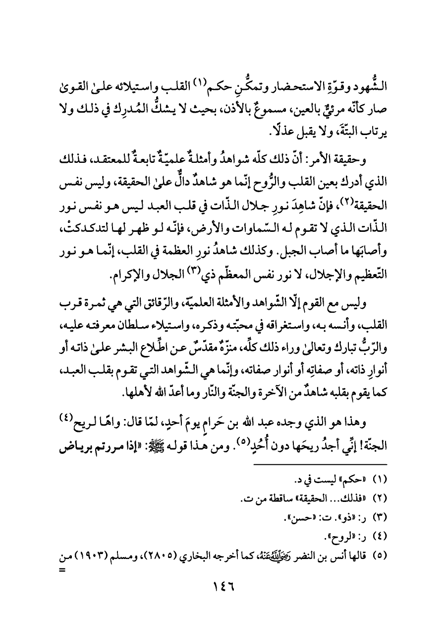 وليس مع القوم إلّا الشّواهد والأمثلة العلميّة، والرّقائق التي هي ثمرة قرب القلب، وأنسه به، واستغراقه في محبّته وذكره، واستيلاء سلطان معرفته عليه، والرّبُّ تبارك وتعالى وراء ذلك كلِّه، منزّهٌ مقدّسٌ عن اطِّلاع البشر على ذاته أو أنوارِ ذاته، أو صفاتِه أو أنوار صفاته، وإنّما هي الشّواهد التي تقوم بقلب العبد، كما يقوم بقلبه شاهدٌ من الآخرة والجنّة والنّار وما أعدّ الله لأهلها.