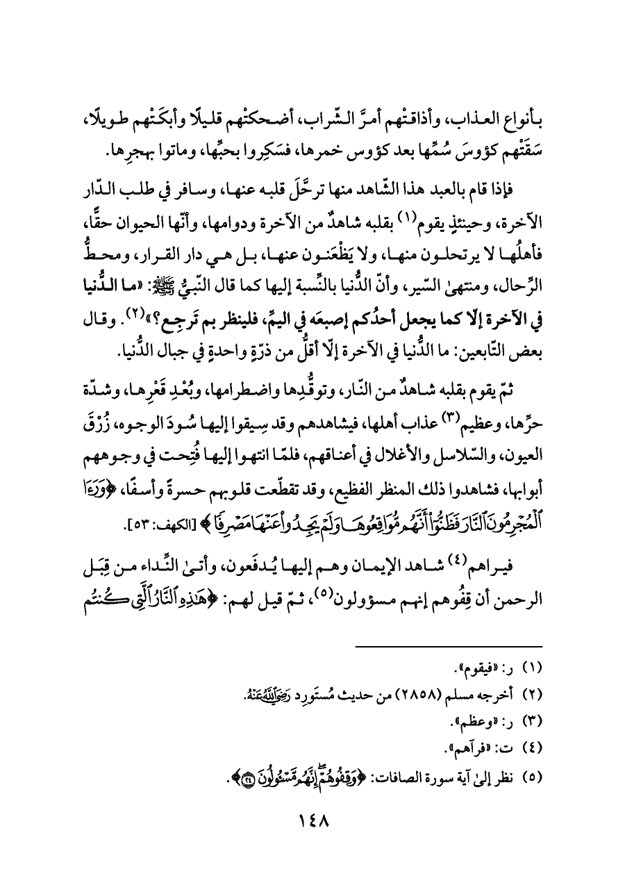 ثمّ يقوم بقلبه شاهدٌ من النّار، وتوقُّدِها واضطرامها، وبُعْدِ قَعْرِها، وشدّة حرِّها، وعظيم (¬٣) عذاب أهلها، فيشاهدهم وقد سِيقوا إليها سُودَ الوجوه، زُرْقَ العيون، والسّلاسل والأغلال في أعناقهم، فلمّا انتهوا إليها فُتِحت في وجوههم أبوابها، فشاهدوا ذلك المنظر الفظيع، وقد تقطّعت قلوبهم حسرةً وأسفًا، {وَرَأَى الْمُجْرِمُونَ النَّارَ فَظَنُّوا أَنَّهُمْ مُوَاقِعُوهَا وَلَمْ يَجِدُوا عَنْهَا مَصْرِفًا} [الكهف: ٥٣].