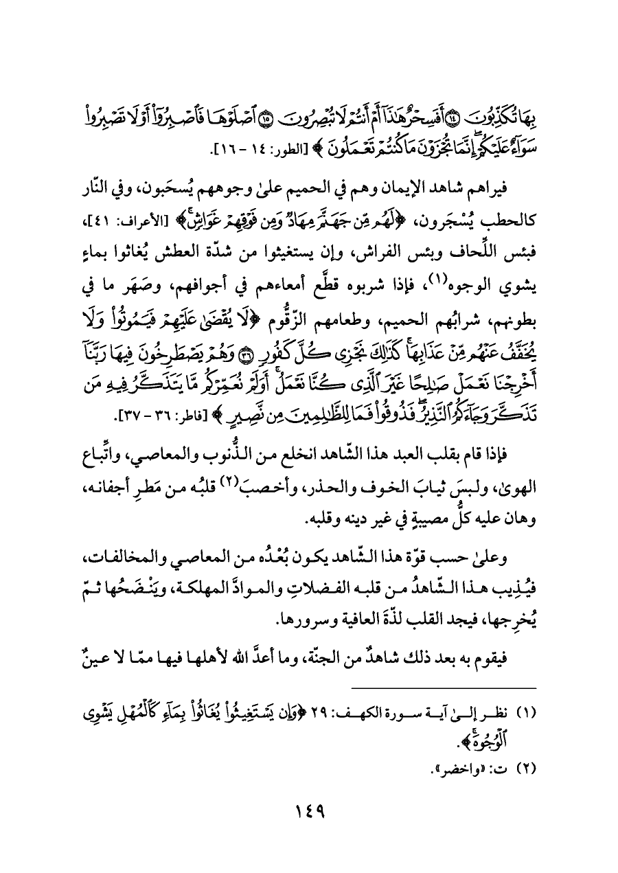 فيراهم شاهد الإيمان وهم في الحميم على وجوههم يُسحَبون، وفي النّار كالحطب يُسْجَرون، {لَهُمْ مِنْ جَهَنَّمَ مِهَادٌ وَمِنْ فَوْقِهِمْ غَوَاشٍ} [الأعراف: ٤١]، فبئس اللِّحاف وبئس الفراش، وإن يستغيثوا من شدّة العطش يُغاثوا بماءٍ يشوي الوجوه (¬١)، فإذا شربوه قطَّع أمعاءهم في أجوافهم، وصَهَر ما في بطونهم، شرابُهم الحميم، وطعامهم الزّقُّوم {لَا يُقْضَى عَلَيْهِمْ فَيَمُوتُوا وَلَا يُخَفَّفُ عَنْهُمْ مِنْ عَذَابِهَا كَذَلِكَ نَجْزِي كُلَّ كَفُورٍ (٣٦) وَهُمْ يَصْطَرِخُونَ فِيهَا رَبَّنَا أَخْرِجْنَا نَعْمَلْ صَالِحًا غَيْرَ الَّذِي كُنَّا نَعْمَلُ أَوَلَمْ نُعَمِّرْكُمْ مَا يَتَذَكَّرُ فِيهِ مَنْ تَذَكَّرَ وَجَاءَكُمُ النَّذِيرُ فَذُوقُوا فَمَا لِلظَّالِمِينَ مِنْ نَصِيرٍ} [فاطر: ٣٦ - ٣٧].