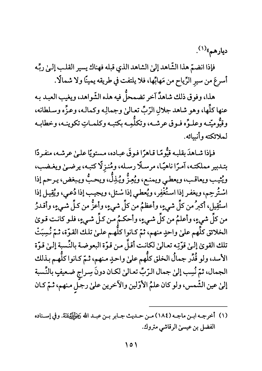 فإذا شاهدَ بقلبه قيُّومًا قاهرًا فوقَ عباده، مستويًا على عرشه، منفردًا بتدبير مملكته، آمرًا ناهيًا، مرسلًا رسله، ومُنزِلًا كتبه، يرضى ويغضب، ويُثيب ويعاقب، ويعطي ويمنع، ويُعِزُّ ويُذِلُّ، ويحبُّ ويبغض، يرحم إذا اسْتُرحِم، ويغفر إذا استُغْفِر، ويُعطي إذا سْئل، ويجيب إذا دُعي، ويُقِيل إذا استُقِيل، أكبرُ من كلِّ شيءٍ، وأعظمُ من كلِّ شيءٍ، وأعزُّ من كلِّ شيءٍ، وأقدرُ من كلِّ شيءٍ، وأعلمُ من كلِّ شيءٍ، وأحكمُ من كلِّ شيءٍ، فلو كانت قوى الخلائق كلِّهم على واحدٍ منهم، ثمّ كانوا كلُّهم على تلك القوّة، ثمّ نُسِبَتْ تلك القوى إلى قوّتِه تعالى لكانت أقلَّ من قوّة البعوضة بالنِّسبة إلى قوّة الأسد، ولو قُدِّر جمالُ الخلق كلُّهم على واحدٍ منهم، ثمّ كانوا كلُّهم بذلك الجمال، ثمّ نُسِب إلى جمال الرّبِّ تعالى لكان دونَ سِراجٍ ضعيفٍ بالنِّسبة إلى عين الشّمس، ولو كان علمُ الأوّلين والآخرين على رجلٍ منهم، ثمّ كان